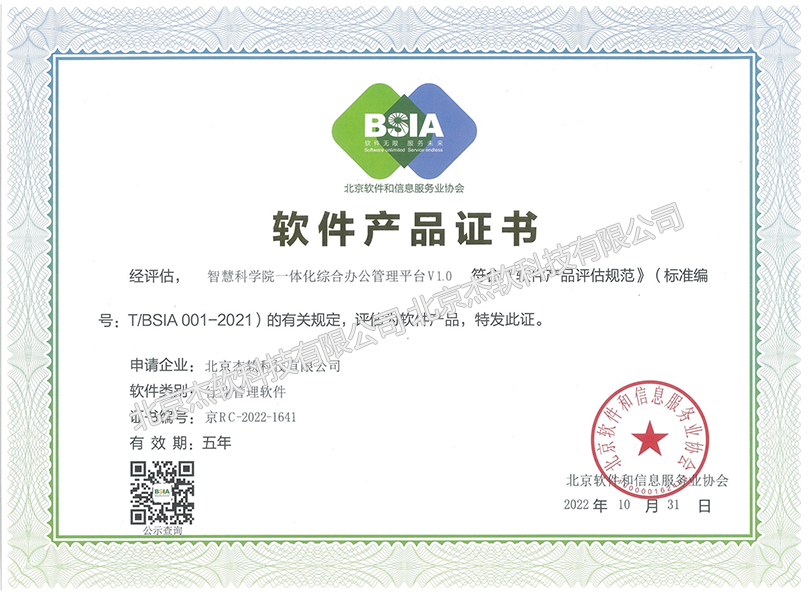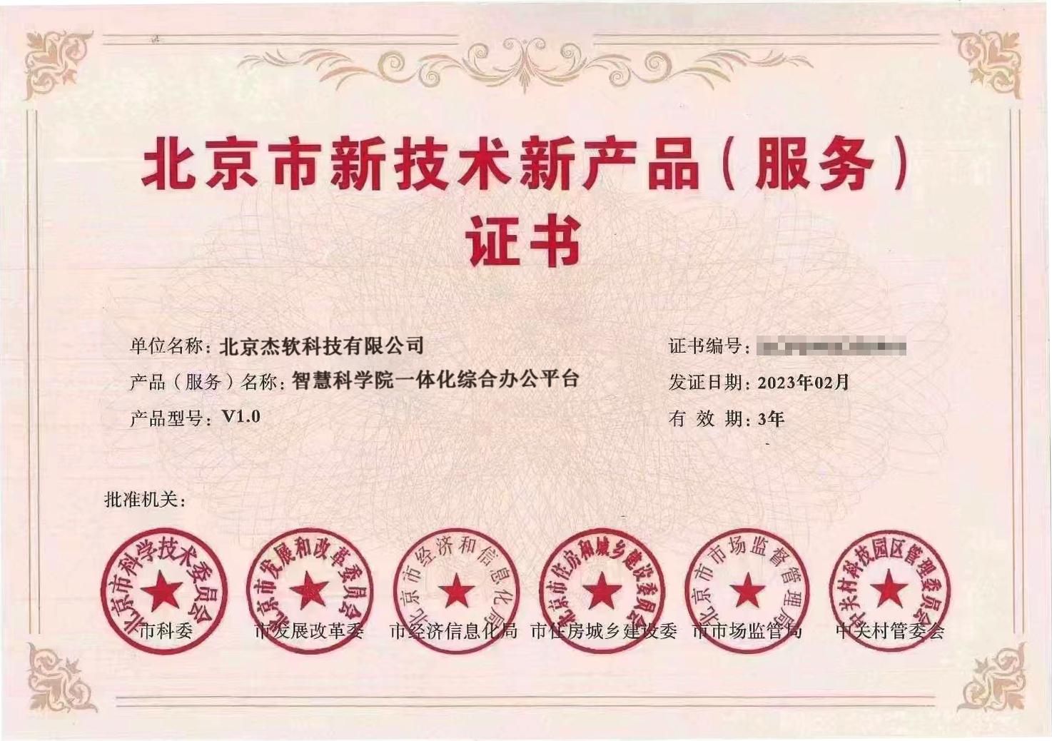 近日,北京杰软科技有限公司研发的智慧科学院一体化综合办公平台,获得由北京市科委、市发展改革委等部门联合颁发的北京市新技术新产品(服务)证书。